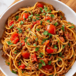 A bold, flavorful fusion of tacos and pasta, this One-Pot Taco Spaghetti delivers saucy ground beef, taco spices, and spaghetti all in one easy, family-friendly meal.