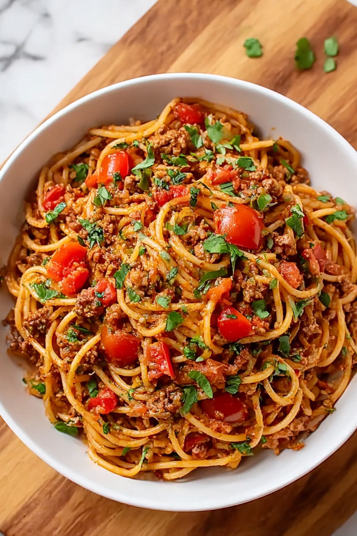 A bold, flavorful fusion of tacos and pasta, this One-Pot Taco Spaghetti delivers saucy ground beef, taco spices, and spaghetti all in one easy, family-friendly meal.