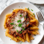 Classic Penne Bolognese made with tender pasta and a rich, savory meat sauce slow-simmered with aromatic vegetables and herbs.