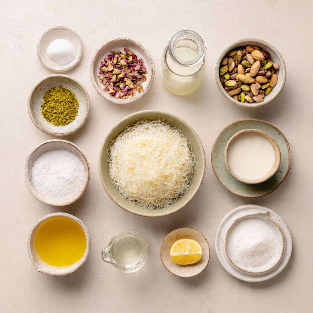 - Unsalted Butter or Ghee: 1/2 cup (melted). Coats the kunafa for golden color and crunch.