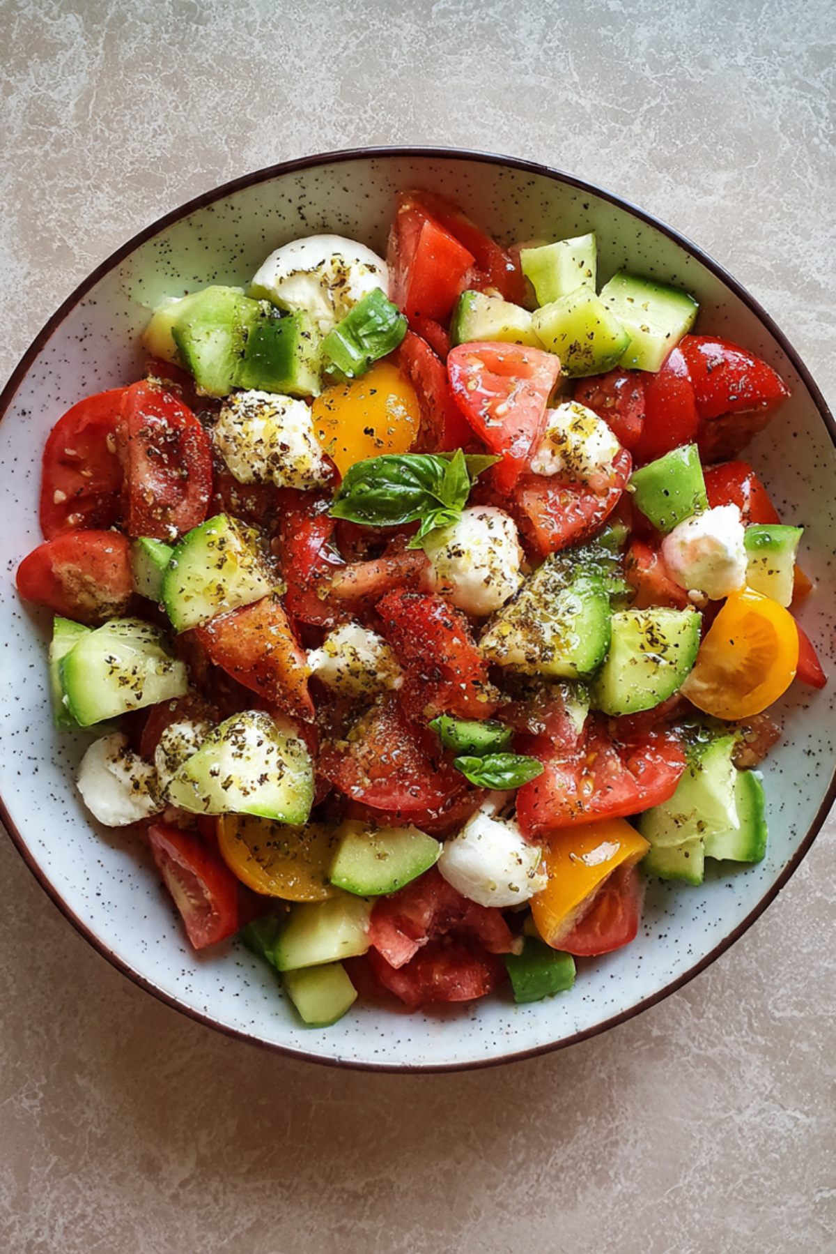 Drizzle the salad with Italian dressing and toss everything together. Add fresh basil on top for extra flavor.