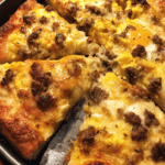 You’ve got crispy, golden crust. Then a creamy sausage gravy layered with pillowy eggs and stringy, melty cheese. The contrast between rich, creamy, and crunchy textures is what makes this pizza irresistible. Every bite is loaded with savory depth and just a hint of spice.