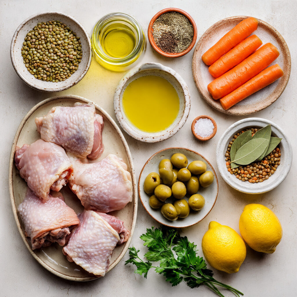 Ingredients in Schmaltzy Lentils with Chicken, Olives & Lemon