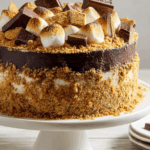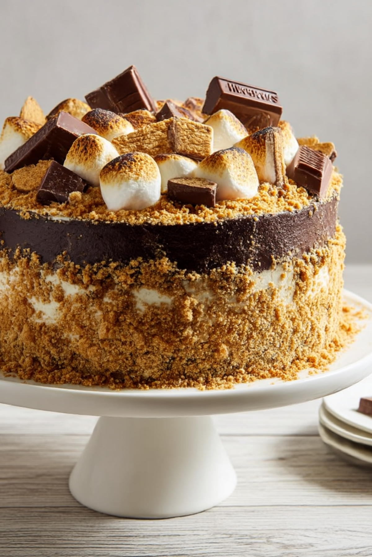 A rich, decadent layered chocolate cake inspired by the classic campfire treat, packed with marshmallows, graham cracker crumbs, and milk chocolate.