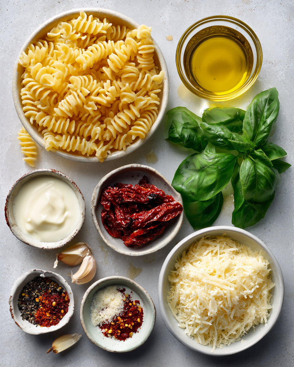 - Sun-Dried Tomatoes (oil-packed): 1/2 cup – Rich and tangy base for the sauce.