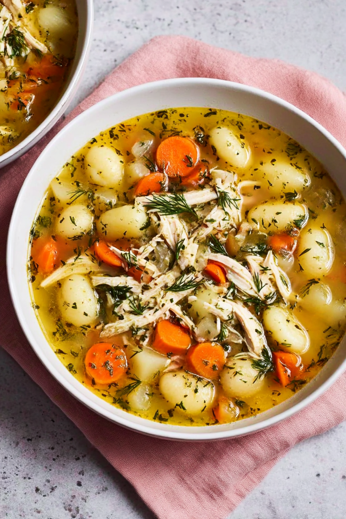 This recipe came to life on one of those early spring days when winter hadn’t quite let go but the sunlight hinted at warmer times ahead. I had leftover roast chicken in the fridge and a packet of gnocchi waiting to be used. With a few fresh veggies and some dill from the garden, this soup just came together like magic. It’s now one of those dishes I reach for whenever I want something comforting but not too heavy.