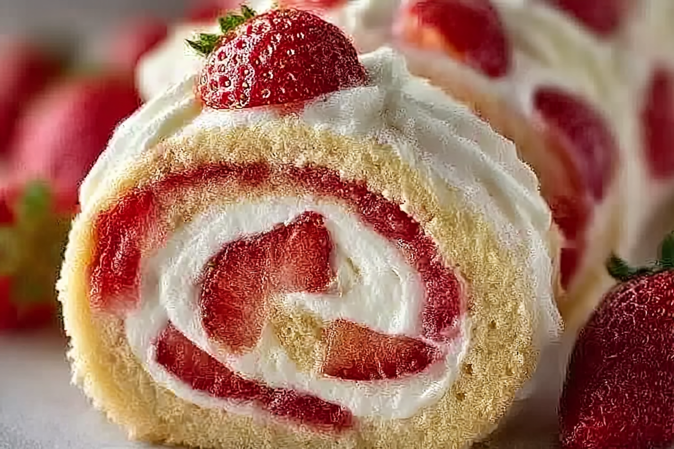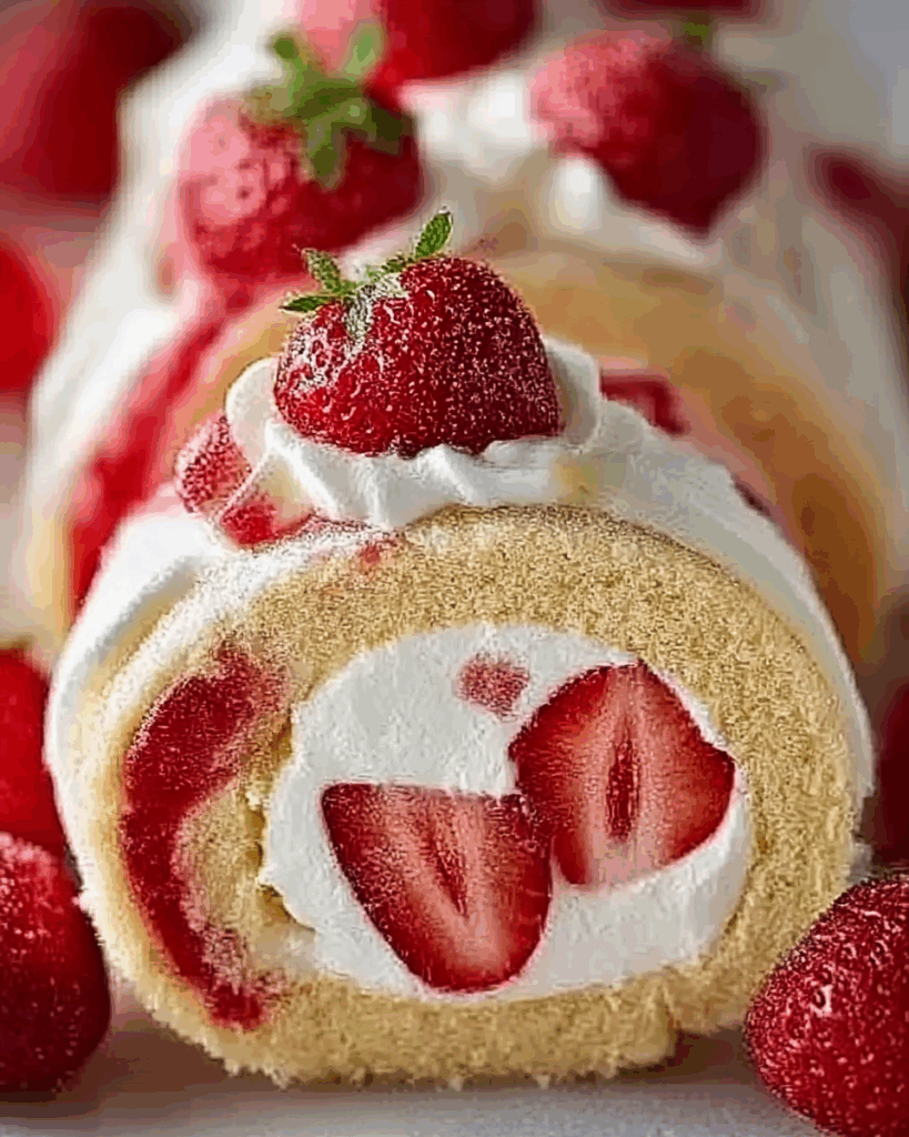 A tender vanilla sponge cake rolled around a rich, fluffy cheesecake filling and studded with fresh strawberries. Elegant, creamy, and perfectly balanced for any celebration.