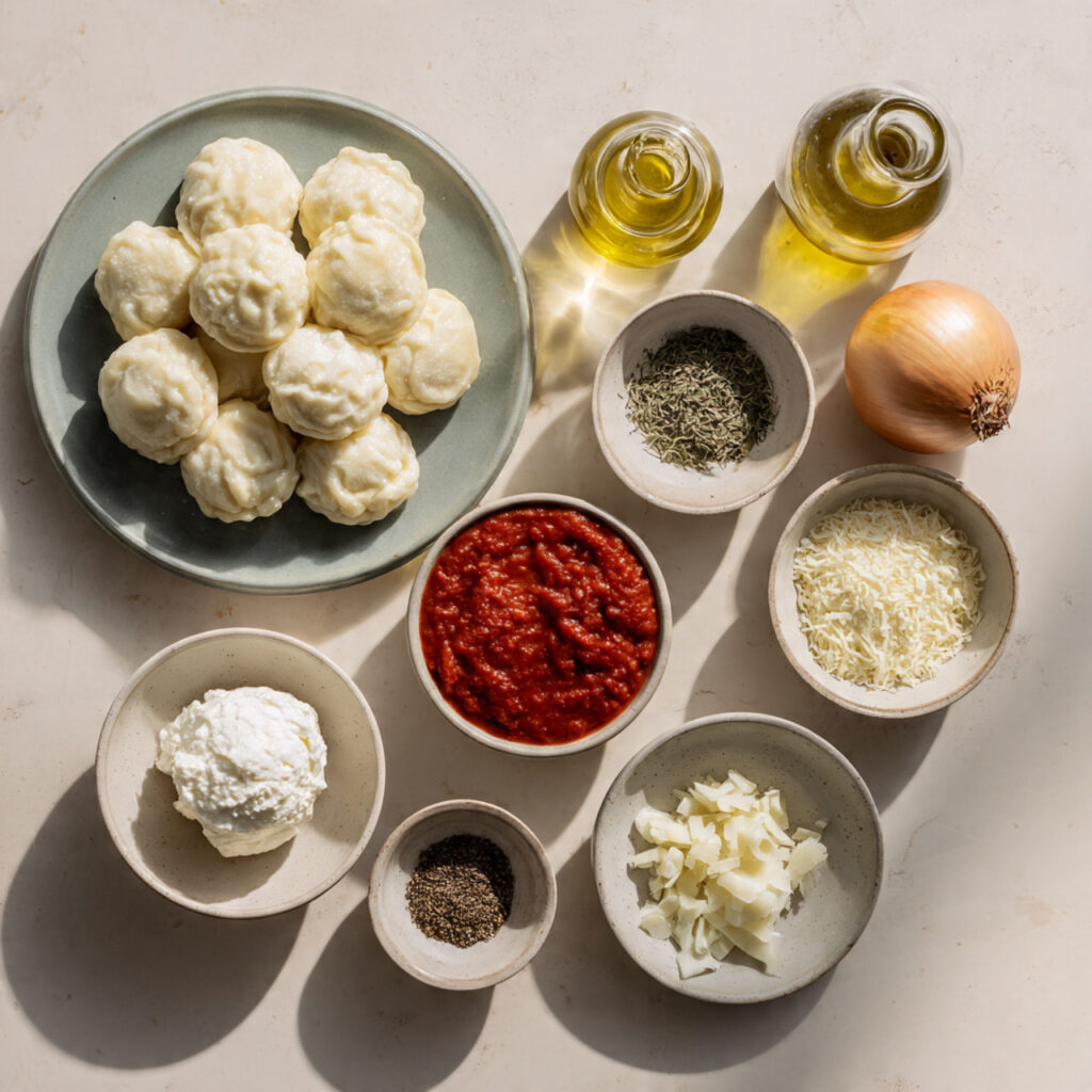 - Assemble the Dish: Layer dumplings, sauce, ricotta, and mozzarella, repeating layers, then finish with parmesan
