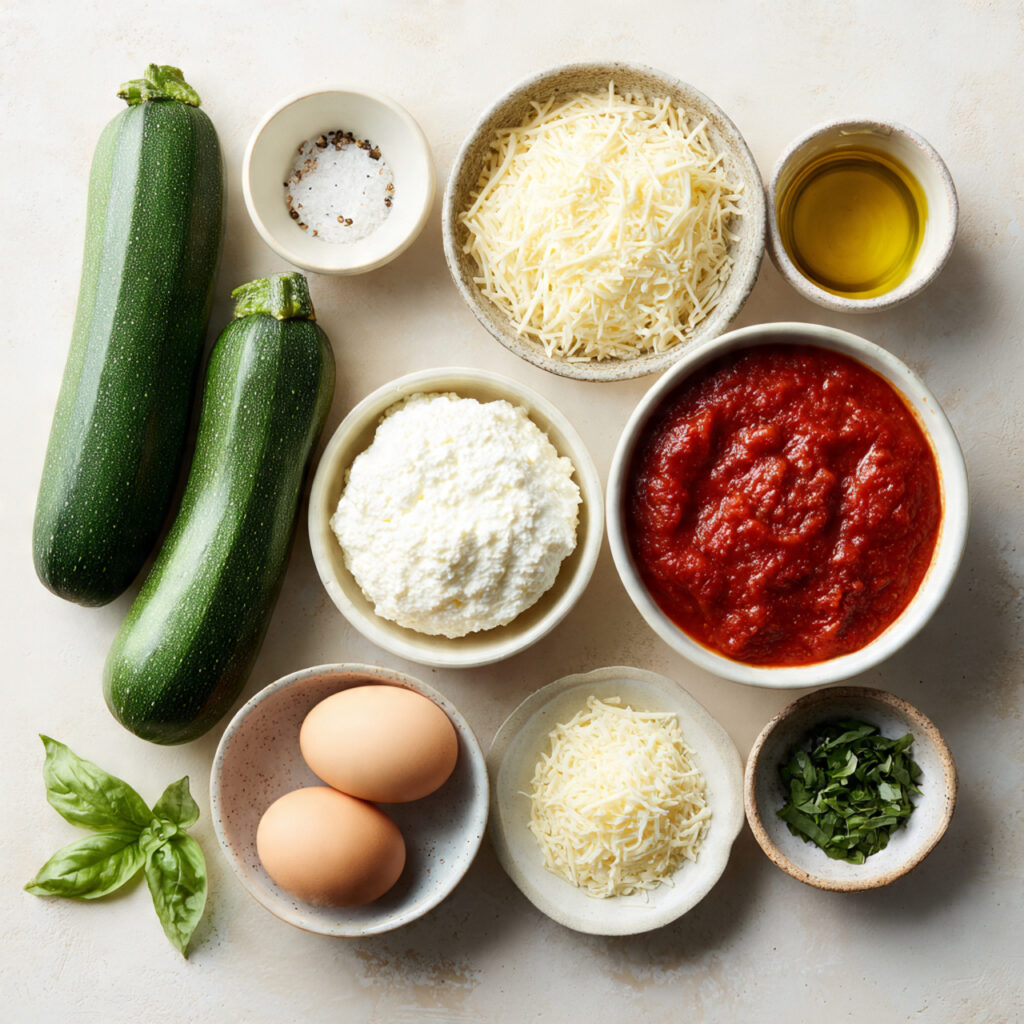 - Zucchini: 3 large, sliced thin lengthwise. Acts as the “pasta” base.
