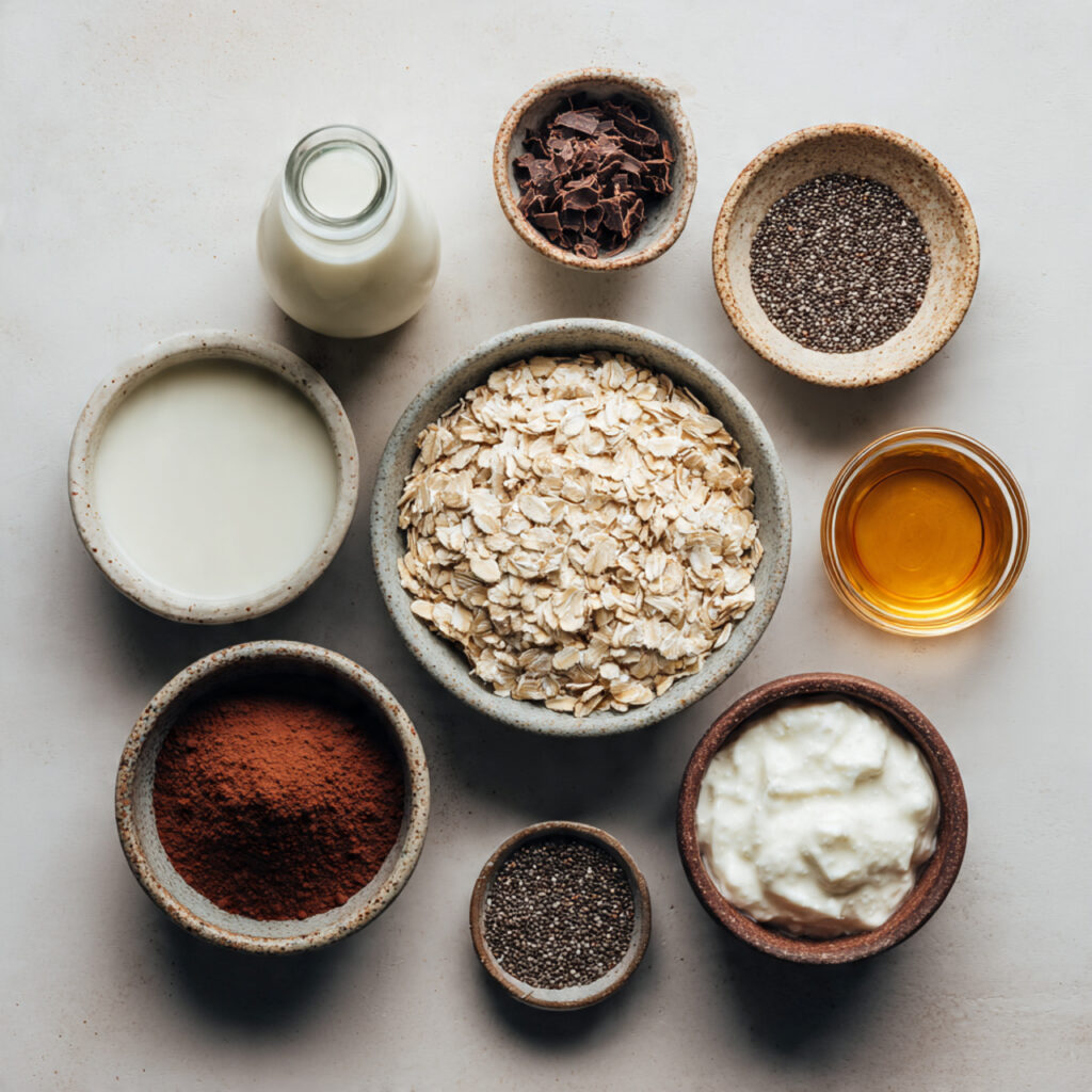 The oats become soft and creamy overnight while the yogurt adds a smooth rich element. Cocoa powder brings a gentle chocolate note that pairs beautifully with the natural sweetness.