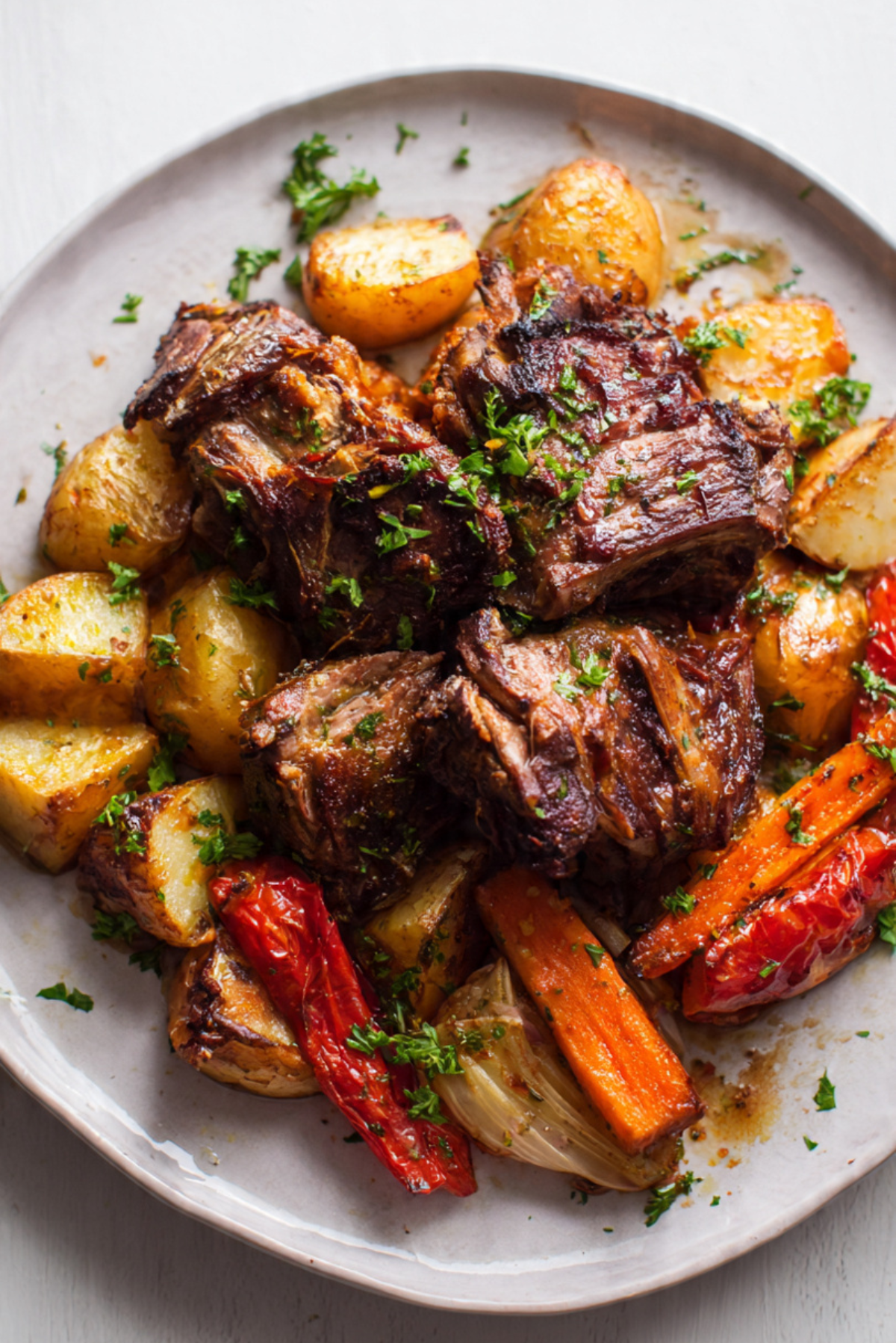 Serve on a large platter with roasted vegetables arranged around the lamb. A sprinkle of fresh herbs adds a beautiful finishing touch.