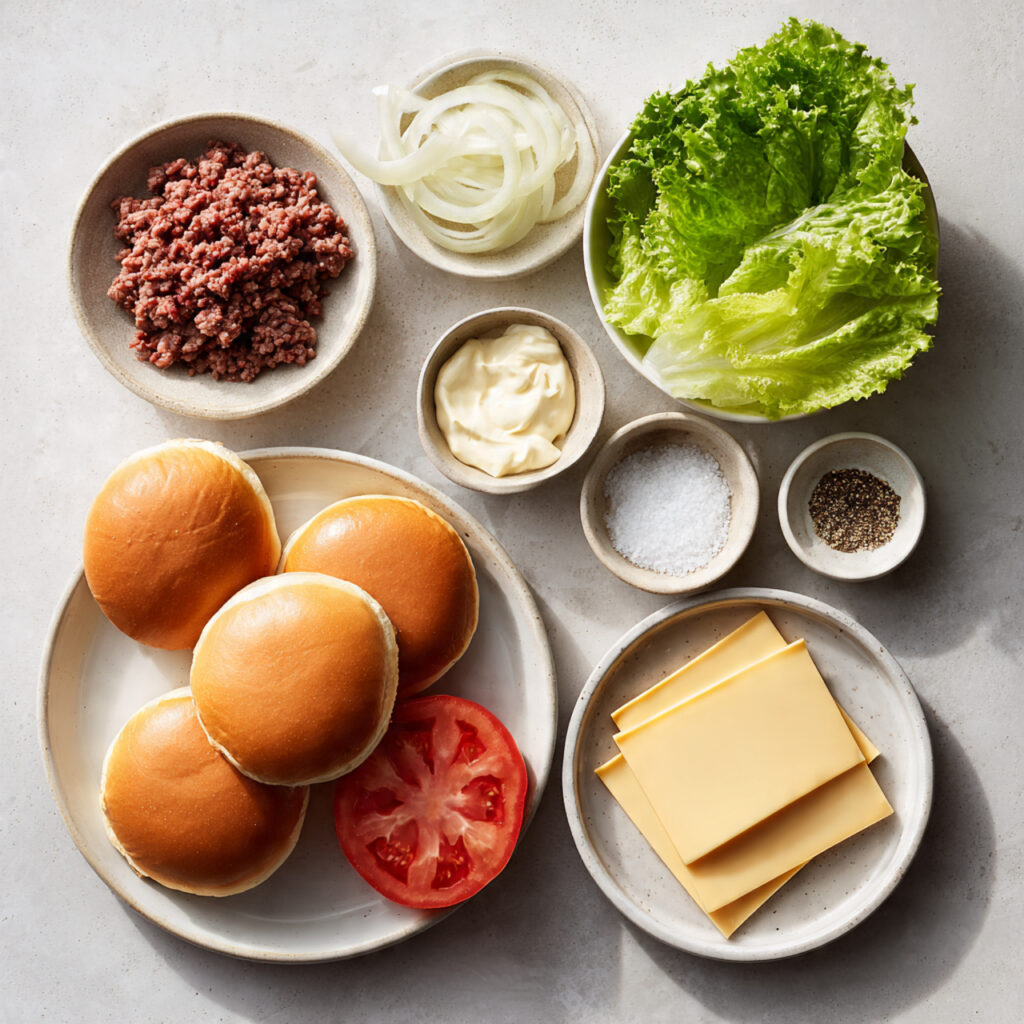 - Ground Beef: 500g, shaped into patties, provides the main flavor.