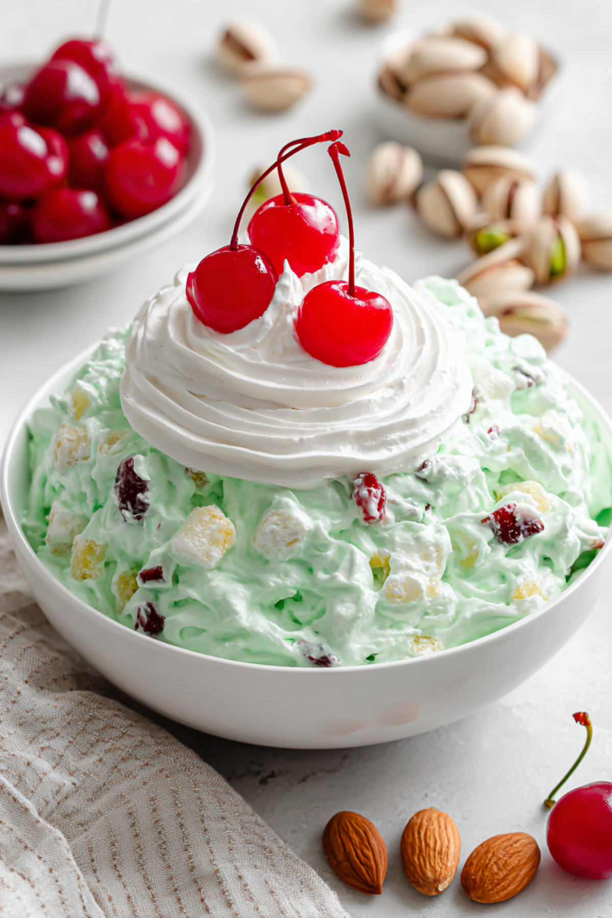 Presentation is easy here. Serve it with a swirl of whipped cream, a bright cherry, and a few chopped pistachios on top. Choose a white bowl to let the green pop or use clear glass for a layered look.