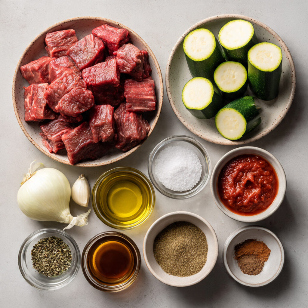 A cozy and hearty one-pot dish featuring tender beef chunks and sautéed zucchini simmered in a savory tomato broth. Perfect with rice or flatbread.